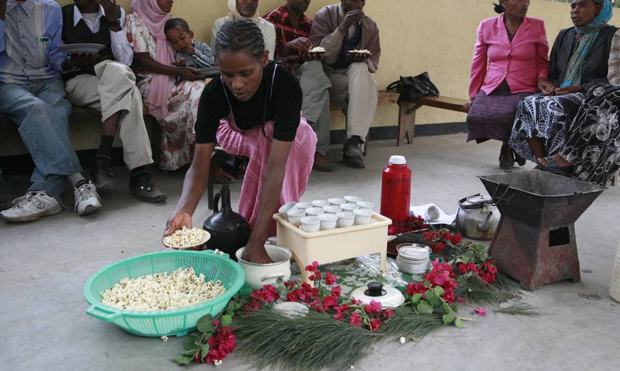 Как правило, ритуал выполняется женщиной, которая сначала воскуривает благовония, дабы защитить присутствующих на протяжении всей церемонии от злых духов. Затем в джебену, специальный керамический сосуд для приготовления кофе, наливают воду, ставят ее на огонь. После этого берут зеленые кофейные зерна и прогревают над углями, чтобы от них легче отделилась шелуха.