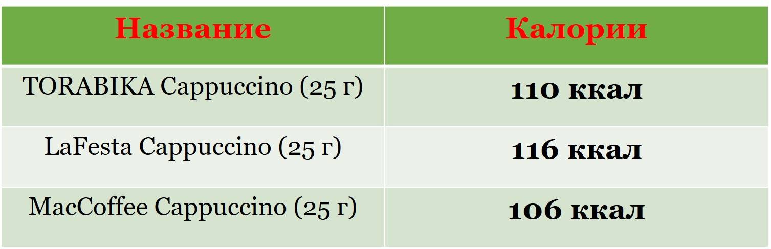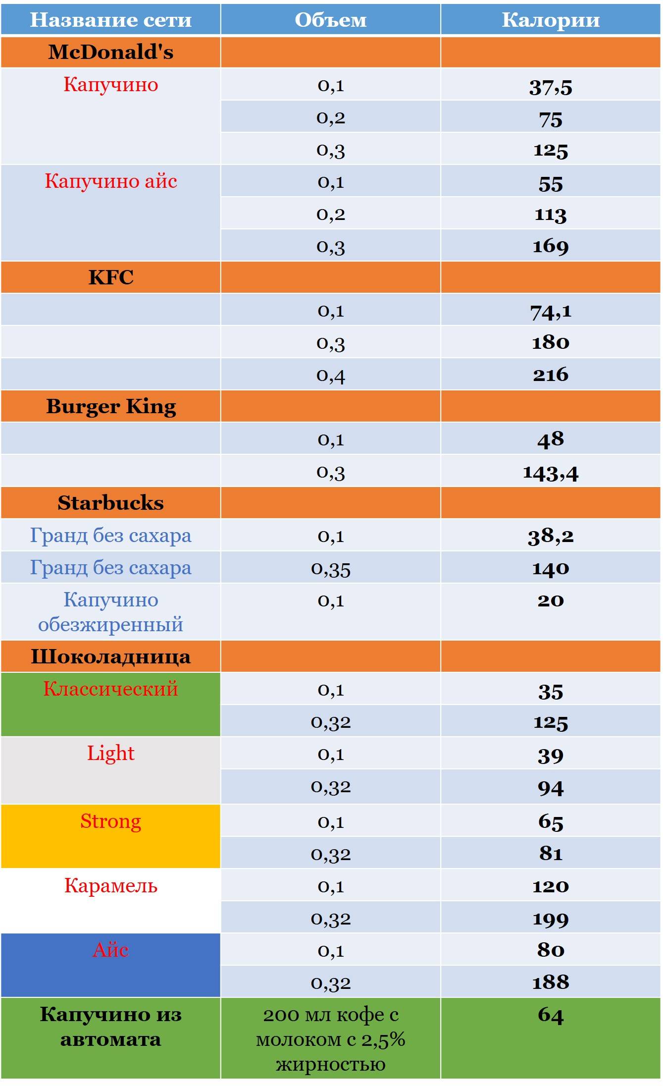 Ниже приводим таблицу калорийности предлагаемых в популярных сетях капучино: