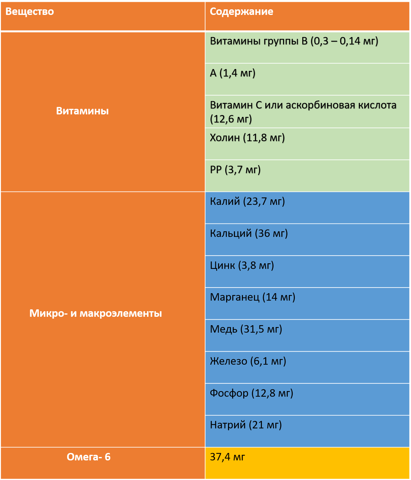 По некоторым данным, в нем содержится также железо, магний, фосфор, калий, селен и цинк. А также имеются витамины группы B, C, РР, Е, K, холин.