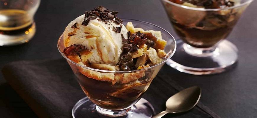 Последний ингредиент, добавляемый в десерт, – ликер, коньяк, ром или бренди. Можно подать их отдельно, чтобы каждый мог добавить себе нужное количество. По общим же рекомендациям: к ванильному мороженому следует добавлять «Бейлис», к шоколадному – коньяк или ром, а «Амаретто» отлично сочетается с ореховым десертом.