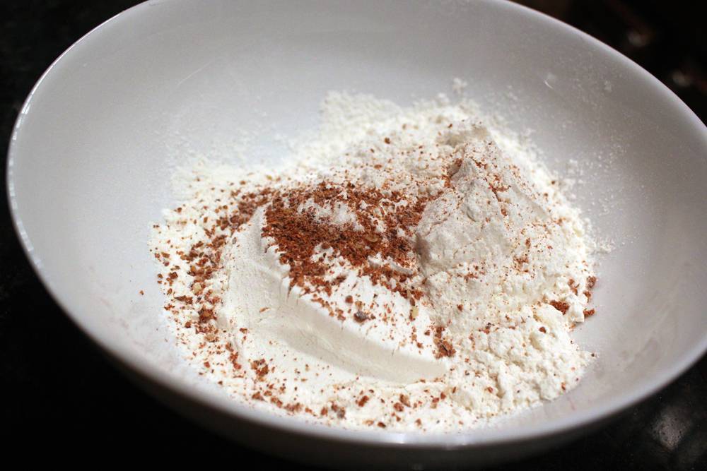 3. Соедините качественную муку с солью, разрыхлителем и корицей, а затем перемешайте. Начните просеивать смесь сухих ингредиентов при помощи сита в миску с основой для теста. Аккуратно и тщательно вымесите гладкое песочное тесто руками в миске.