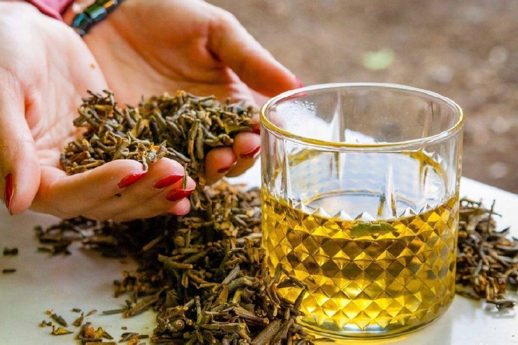 - Тонизирующий чай. Для 1 чашки берём щепотку измельчённых, 2–3 целых листика или 1 побег со стеблем. Высыпаем сырьё в термос, заливаем горячей водой. Настаиваем 30 минут.