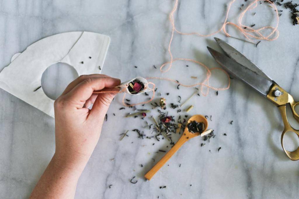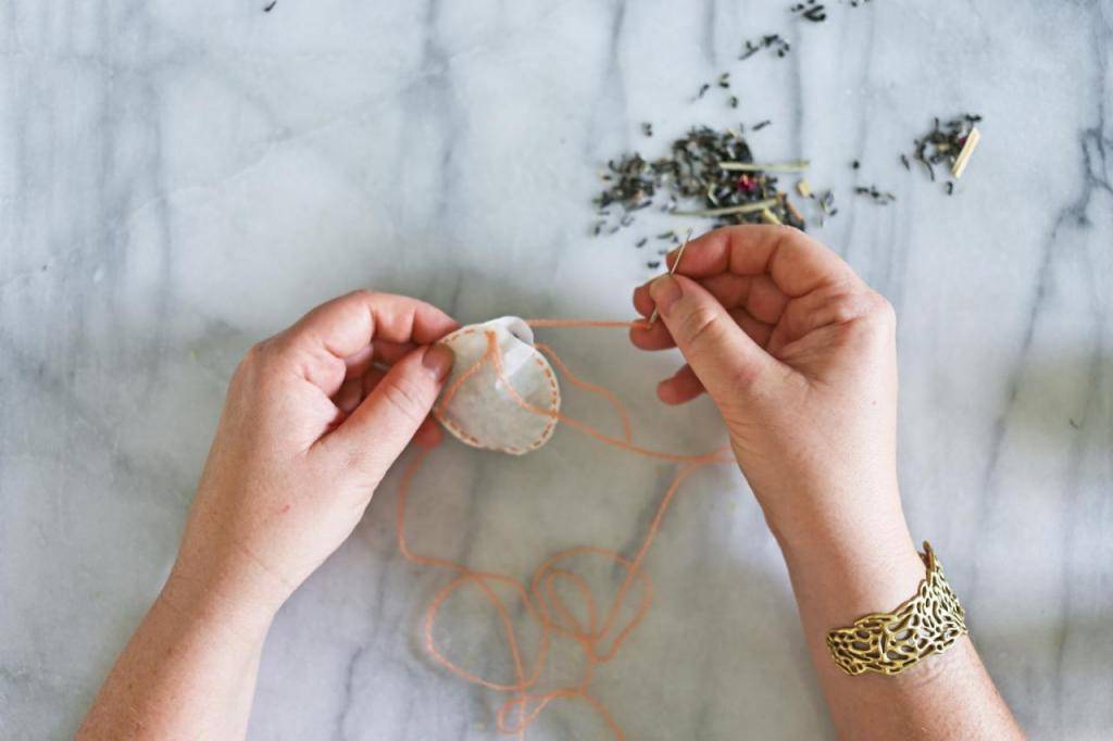 На этом этапе работы следует заполнить пакетик листовым чаем или чаем с добавлением листьев мяты, ромашки, липы, кусочков лимона или имбиря.