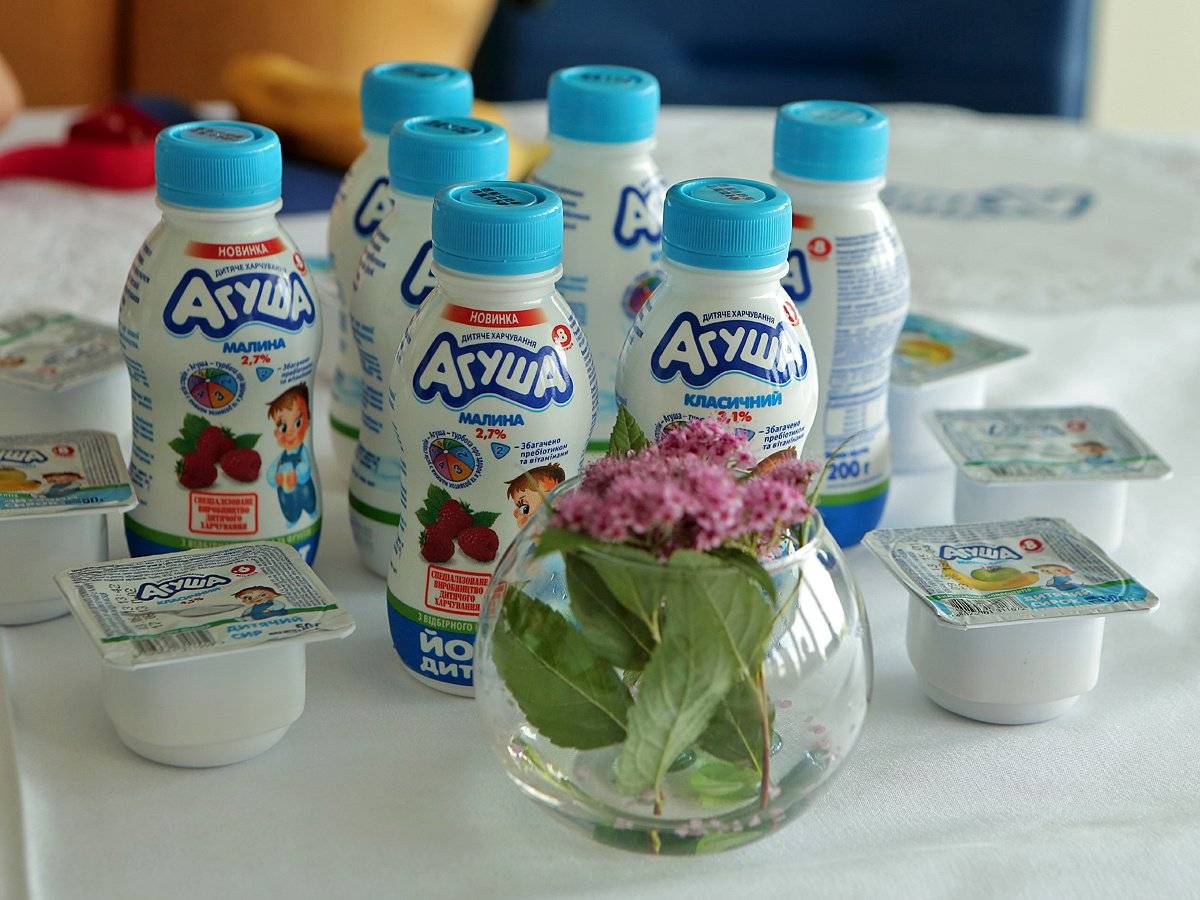 - «Агуша» — продукция для детишек от полугода: баночное пюре, сухие каши, фруктовый творог, молоко с добавлением пробиотиков и витаминов, морсы;