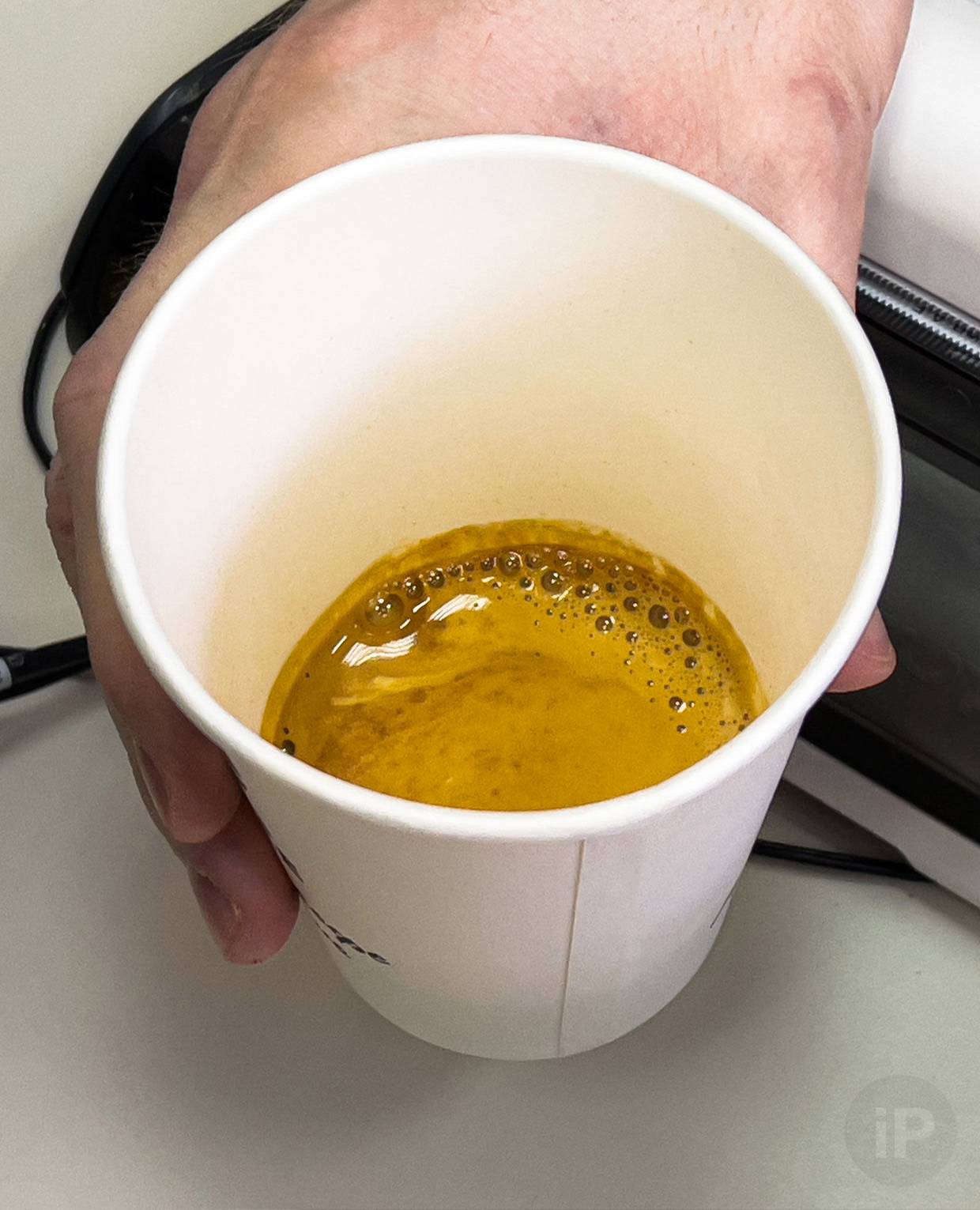 Сначала наливают кофе, потом воду. На поверхности образуется тончайшая крема, смесь из масел и углекислого газа. Здесь только кофейный вкус.