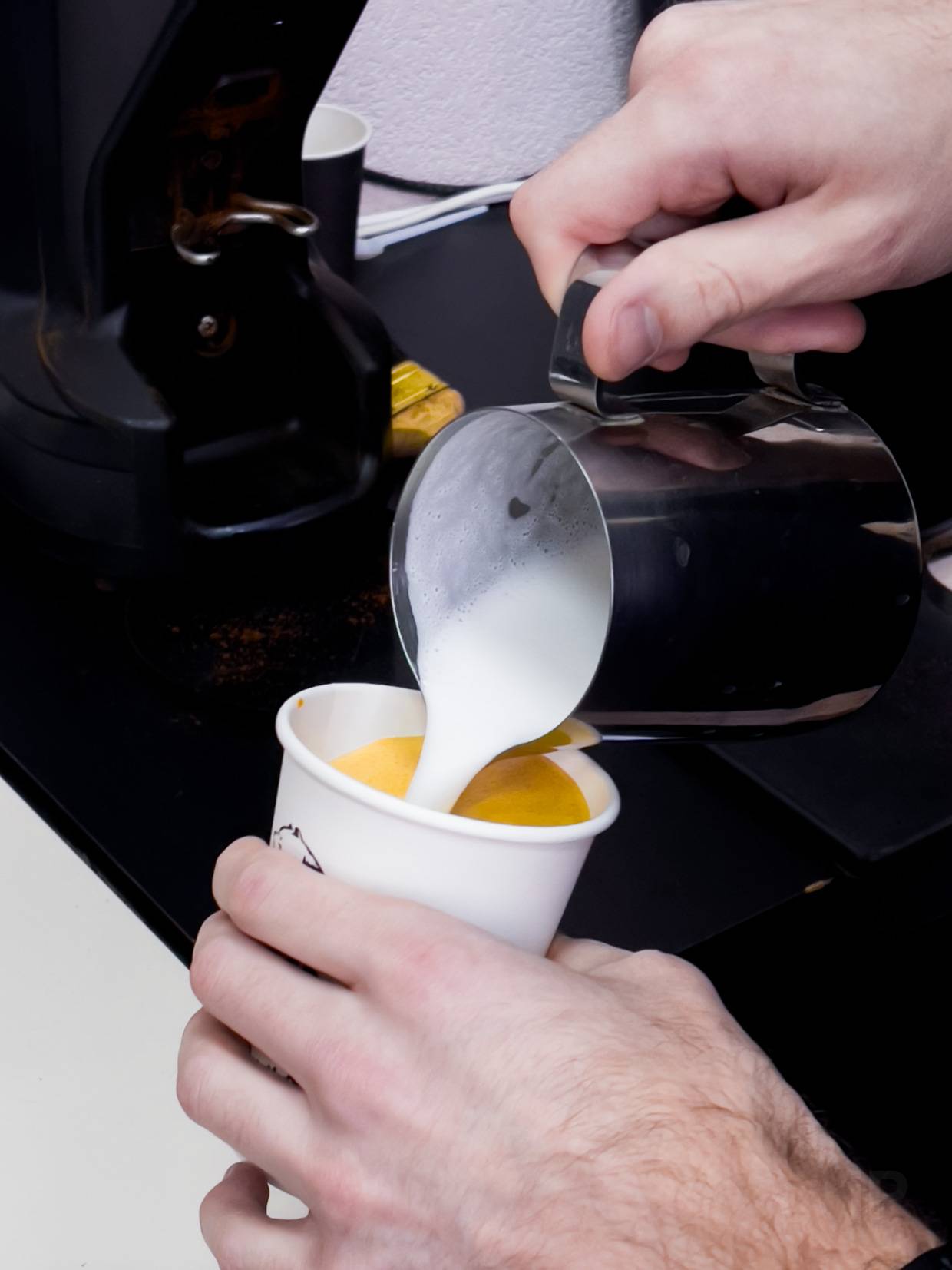 - Взбитое молоко равномерно влить в эспрессо.