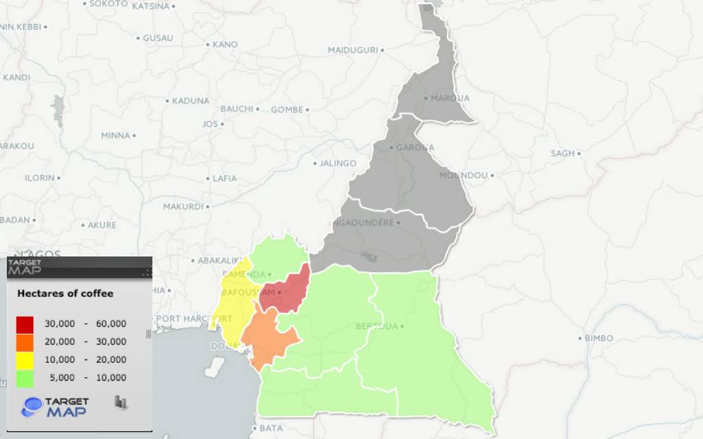 Сегодня кофе в Камеруне производится в семи регионах: Западном, Северо-Западном, Литторал, Юго-Западном, Южном, Центральном и Восточном. Арабику выращивают на высокогорных плато Bamileke и Bamaoun, плантации робусты расположились в низинах. Около 10% выработки реализуется на внутреннем рынке, за производство кофе в стране отвечают государственные структуры MINADER (Министерство Сельского Хозяйства и Сельского Развития) и MINRESI (Министерство Научных Исследований и Инноваций).