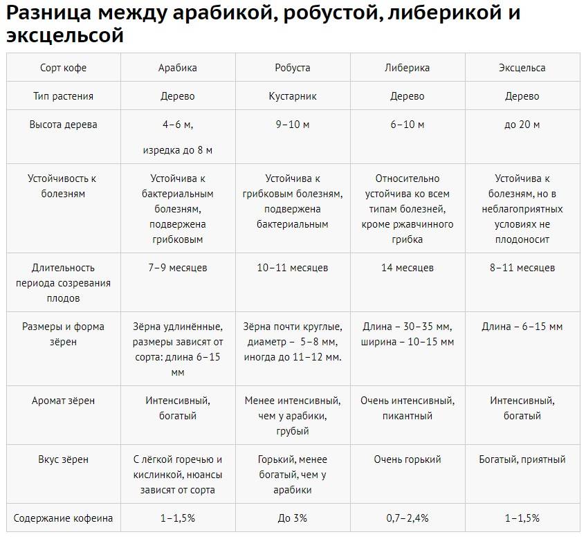 Для изготовления ароматного напитка применяются следующие виды кофейных бобов: