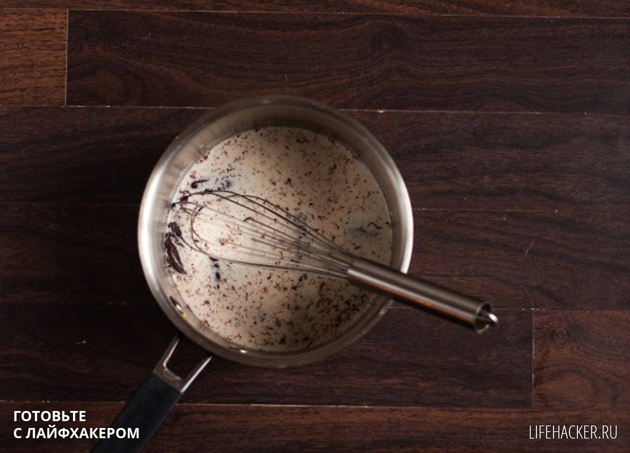 Сперва подогрейте 150 мл молока, уберите его с огня и приготовьте шоколадный ганаш, добавив к молоку кусочки шоколада и, помешивая, растопив их.