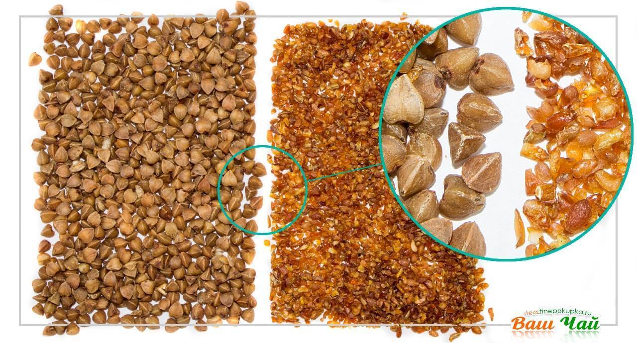 На фото, сравнение гречневой крупы и семян лечебного гречишного чая.