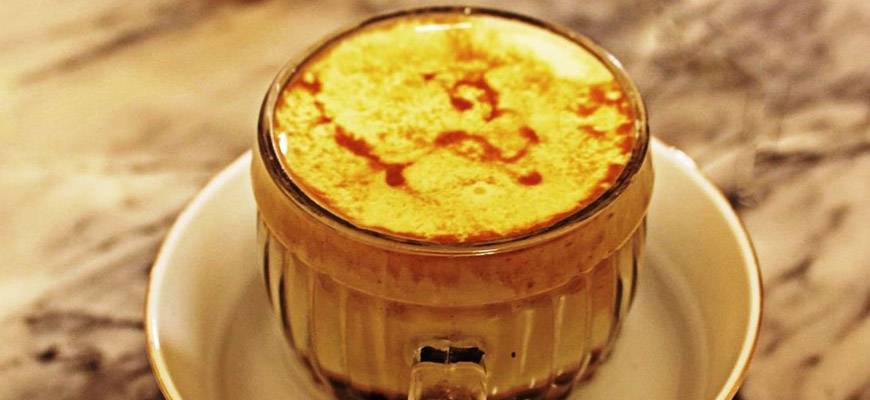 Поверх кофе уложить «шапку» из взбитых с сахаром или со сгущенкой яиц. Сначала съедают пышную яичную сладкую массу, затем выпивают горячий или ледяной напиток.