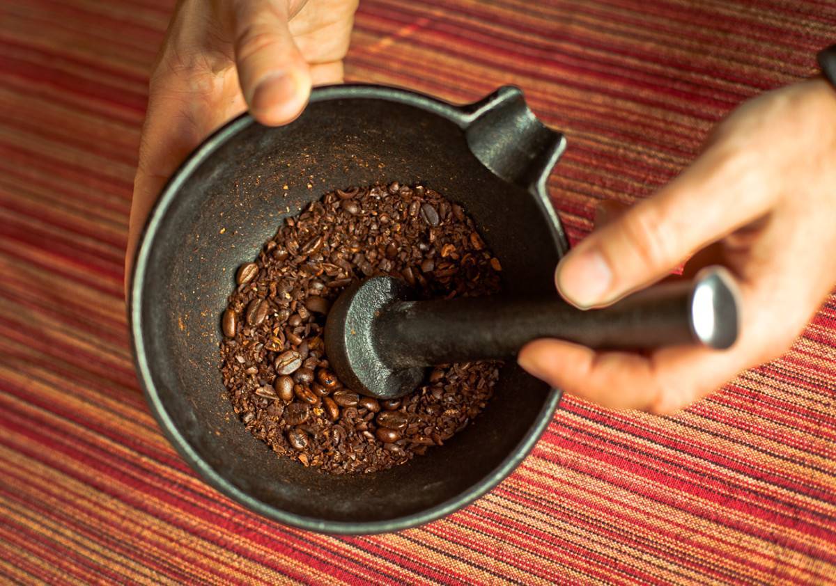 В ступку нужно насыпать небольшую порцию бобов. При помощи пестика кофе сначала раздавливают, затем начинают измельчать до нужной фракции, энергично толкут в ступке. Для получения однородного помола не нужно насыпать много бобов.