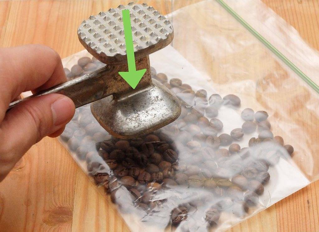 Альтернативный способ ручного помола – раскрошить бобы молотком. Чем интенсивнее измельчение, тем мельче фракция приготовленного продукта. Подходит разделочный, обычный молоток или киянка. Как помолоть кофе:
