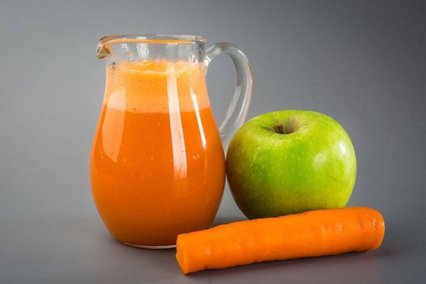 Отжатый яблочный и морковный соки смешивают в эмалированной посуде, соблюдая соотношение два к одному.