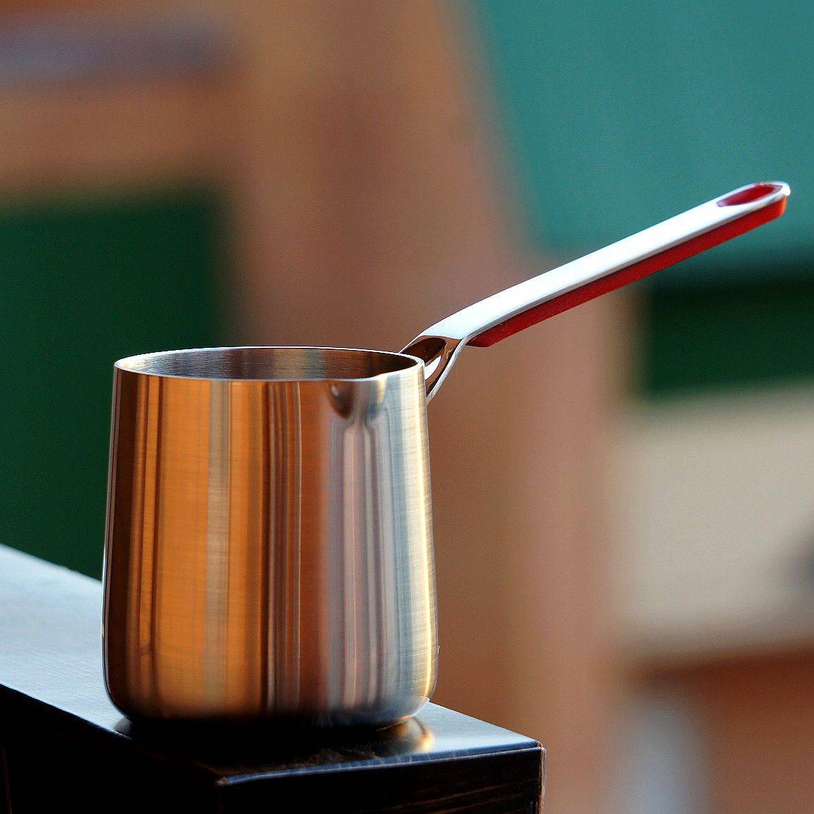 Турки из нержавеющей стали могут быть универсальным и неплохим вариантом вместо изделия из меди. Металл не вступает в реакцию с продуктом, не выделяет вредных веществ. При этом он очень прочный, его можно сколько угодно ронять, бить – останется как новенький.