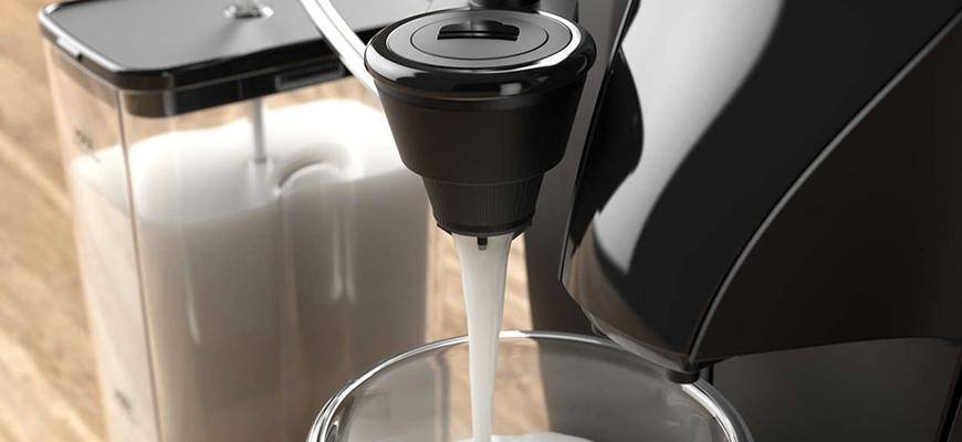 Кофеварка оснащена капучинатором. С его помощью можно приготовить капучино и латте. Контейнер для молока съемный. Он устанавливается в корпус кофеварки с помощью защелки, которая разблокируется при помощи специальной кнопки. Контейнер сделан из прозрачного пластика. На нем есть отметки минимального и максимального уровня (до 400 мл). Соотношения молока и пены можно отрегилировать вручную. С помощью дополнительной трубки для подачи молока можно отказаться от использования контейнера и забирать молоко непосредственно из заводской упаковки.