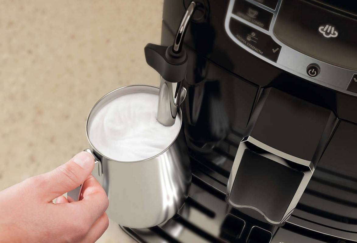 Следующая кофемашина, вошедшая в наш топ 7 лучших устройств для варки кофе — машина Saeco Lirika One Touch. Эта автоматическая эспрессо-кофемашина готовит прекрасный кофе. У нее есть удобная насадка для автоматического приготовления молочно-кофейных напитков – Cappuccinatore. Это нечто среднее между отдельным кувшином для молока и полуавтоматическим капучинатором с отводной трубкой. Для забора молока может использоваться и отводная трубка, которую нужно опустить в емкость с молоком, что намного удобнее, чем использование встроенного, комплектного кувшина. Весь модуль при этом работает как полноценный молочный автомат. Машина управляет им самостоятельно, включая в нужное время, контролируя заданный объем пенно-молочной смеси. Вывод молока располагается рядом с форсунками для кофе, то есть не надо переставлять стакан с напитком. В итоге на выходе получается возможность готовить капучино, латте с пышной мелкодисперсной пенкой в одно нажатие соответствующих клавиш.