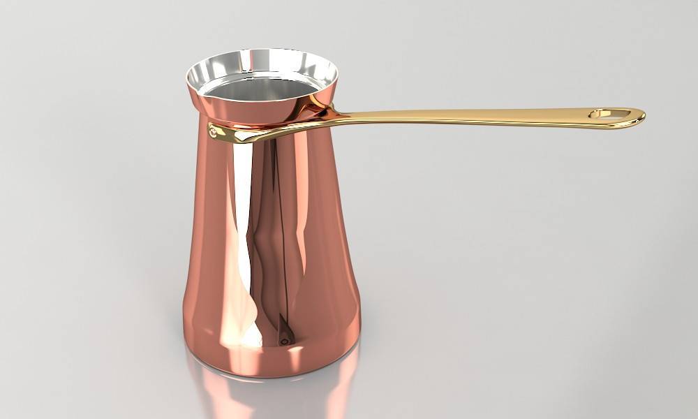 Медь – эталонный материал для турецкой джезвы. Он нагревается быстро, но равномерно, благодаря чему содержимое сосуда также равномерно прогревается. Кроме этого, медь податлива. Из нее можно сделать сосуд разнообразной формы. Именно медные джезвы считаются самыми правильными, так как имеют наименьший диаметр горлышка и наибольший донышка. Турка из меди внутри должна быть покрыта оловом, чтобы не допустить проникновение вредных компонентов сплава в приготавливаемый напиток