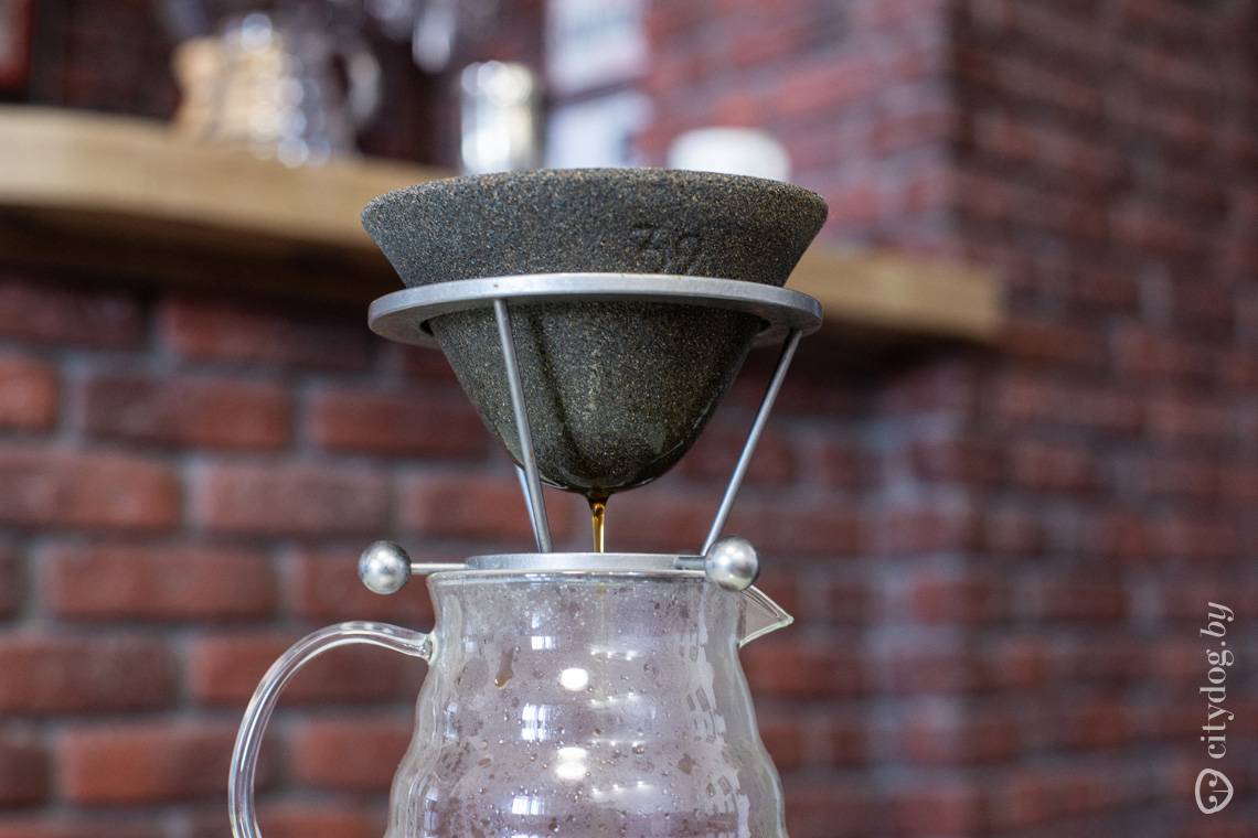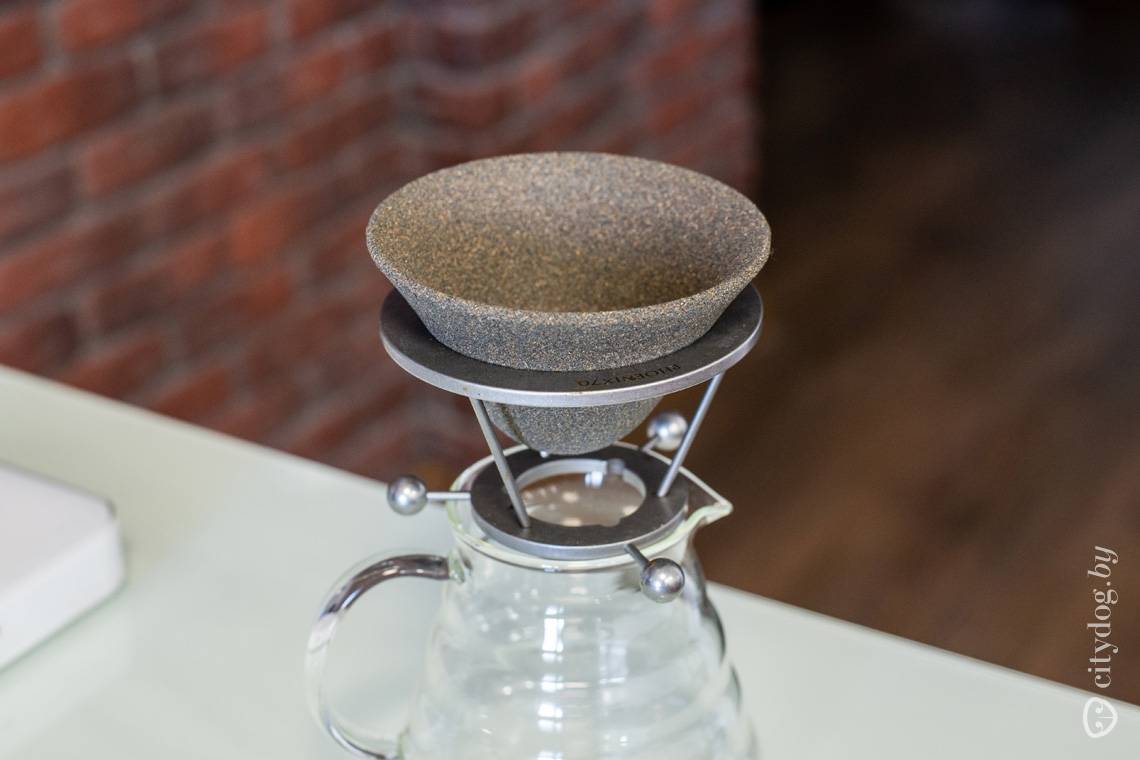 – Новое приспособление, появившееся только в конце 2018 года в очень ограниченном количестве. Это японская пористая керамика, которая пропускает масла, но не пропускает мелкие частицы. В результате получается что-то среднее между фильтр-кофе и тем, что заваривается просто в чашке.