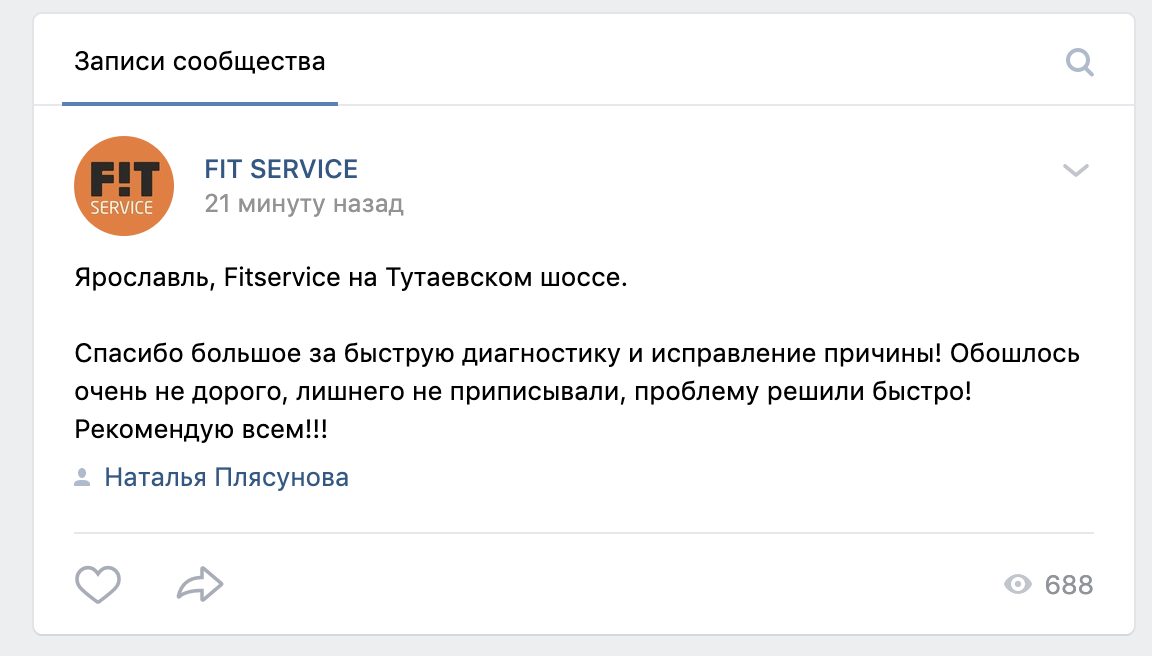 В интернете еще кто-то кому-то верит? Федеральная сеть автомастерских ФИТ Сервис использует настоящие отзывы от своих клиентов и периодически публикует их в своем ВК-сообществе. Такой отзыв раскрывает наиболее распространенные опасения потенциальных клиентов и несмотря на это, звучит естественно, доказывая в очередной раз, что работа с текущими клиентами – лучшая инвестиция в маркетинг.