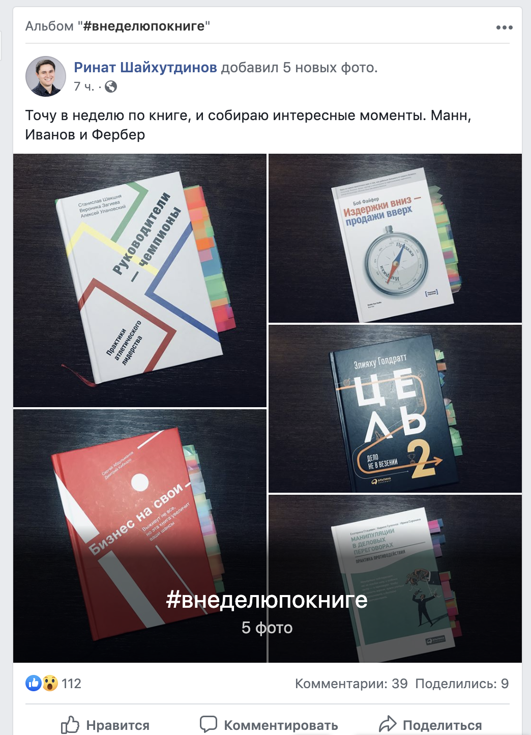 Пользователь, купивший в издательстве “Манн, Иванов и Фербер” набор книг, рассказывает своим друзьям и подписчикам на Фейсбуке о том, какую он читает литературу и… от какого издательства. Каждое фото дополняется клиентом персональной выжимкой из прочитанных им книг, что еще больше персонализирует контент и добавляет в него индивидуальности и пользы.