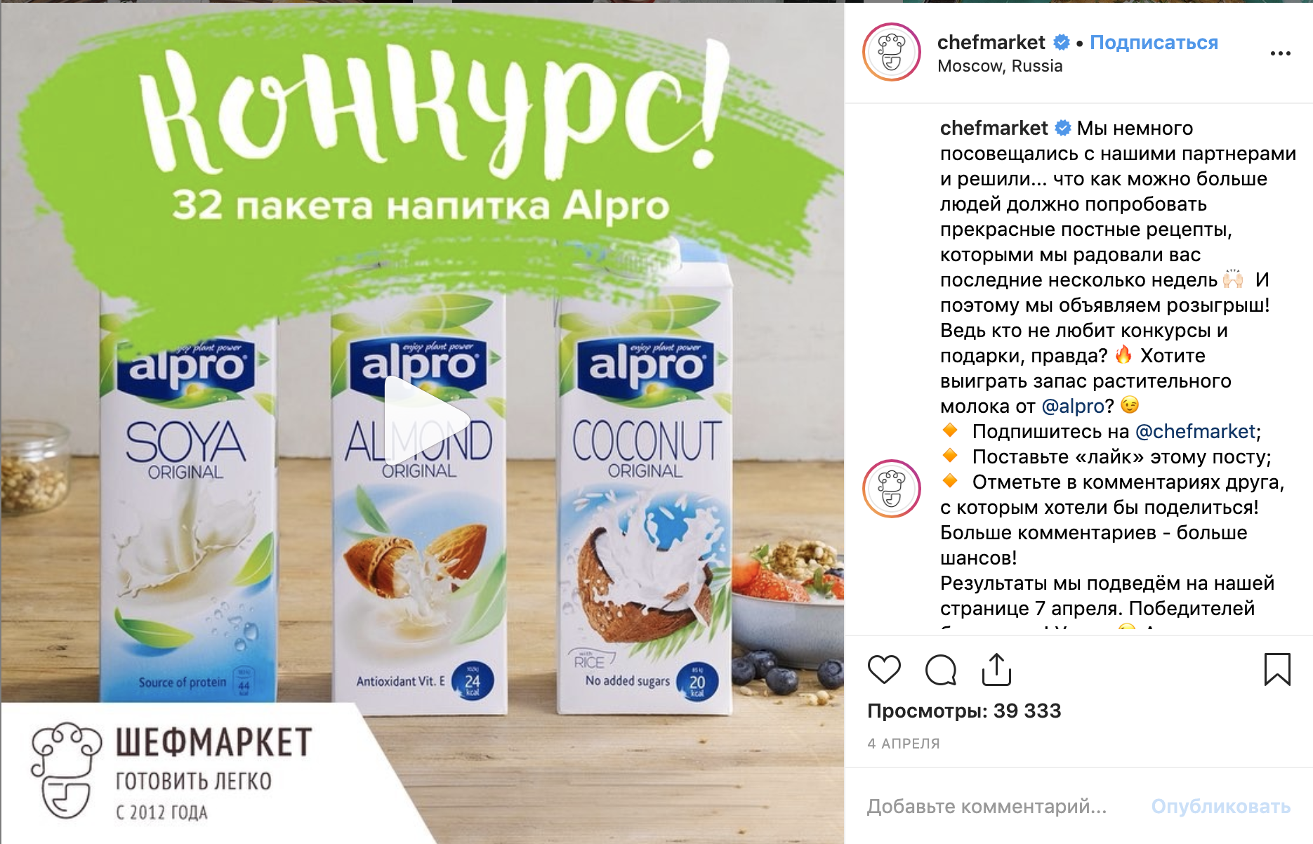 Сервис доставки еды Шефмаркет тоже устраивает конкурсы для своих клиентов и амбассадоров, используя классические механики продвижения бренда через упоминания в Instagram. В этой активности примечатально, что бренд привлек к ней компанию-партнера, которая аналогичным образом получает охват марки своей продукции, что помогает ей знакомить с ним свою целевую аудиторию и выводить на рынок новый продукт.