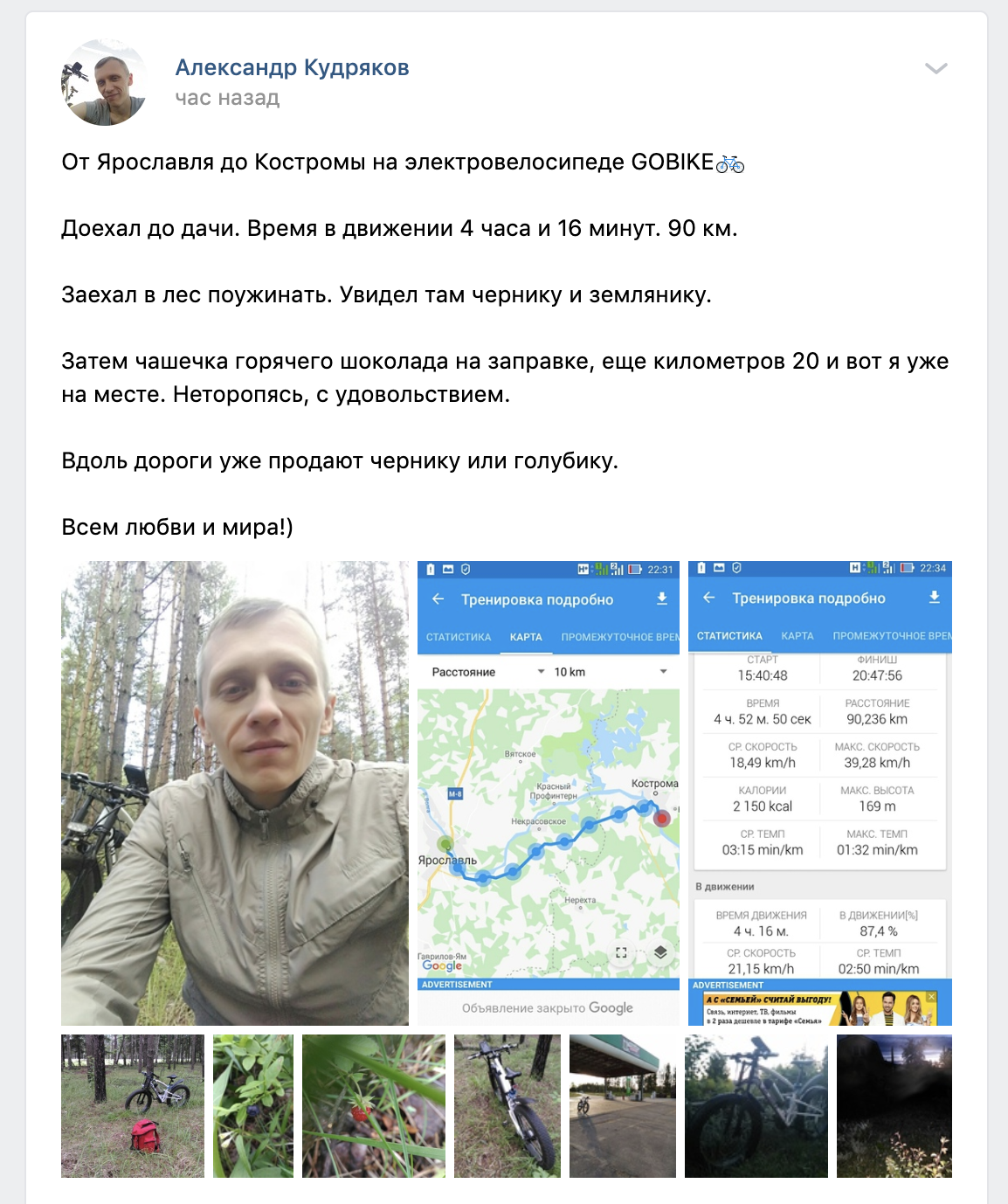 Пользователь электровелосипеда Gobike на собственном примере показывает, на что способен купленный им велосипед GOBIKE, прикладывая к публикации отчет и фотографии из своего небольшого путешествия по российским дорогам.