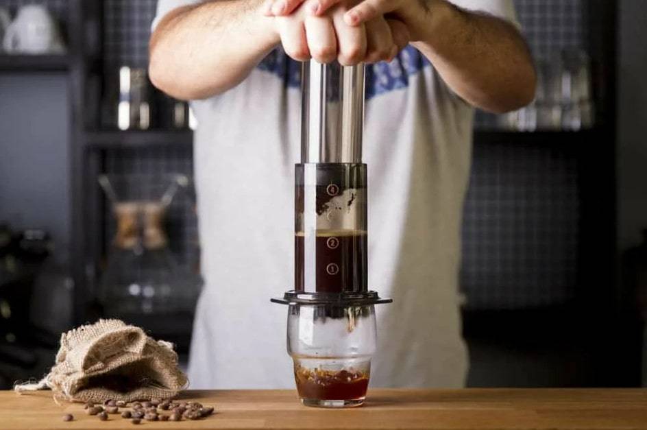 Интересная технология с помощью интересного приспособления в виде своеобразного шприца с поршнем. Кофе проходит через бумажный фильтр и по вкусу напоминает эспрессо. Это очень быстро, но нужен мелкий помол.