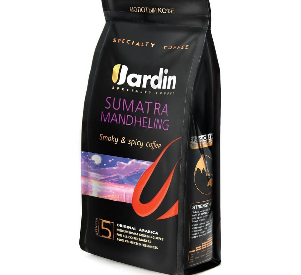 Молотый зерновой кофейный напиток сильной степени обжарки состоит из 100% арабики, выращенной в солнечной Суматре. В аромате имеются нотки шафрана и темного шоколада, а также сухого табачного листа, послевкусие сладкое и имеется слабо выраженная кислинка. Такой кофе можно готовить как в турке, так и в кофеварке, но не рекомендуется употреблять людям с сердечными заболеваниями, так как он является достаточно крепким, можно разбавить его молоком или сливками.