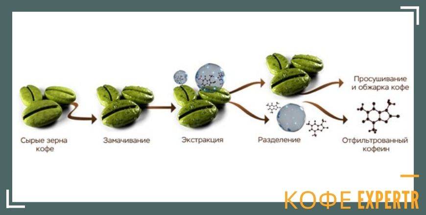 Погруженные в эту жидкость зерна отдают ей кофеин. Растворитель позднее удаляется с помощью угольных фильтров и «прополаскивания» зерен в воде.