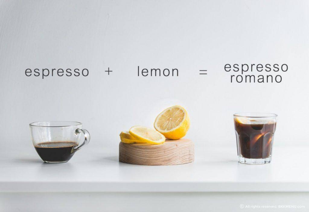 - Романо: в стандартную порцию эспрессо добавляют 5 мл свежевыжатого лимонного сока. Пенку посыпают щепоткой лимонной цедры.