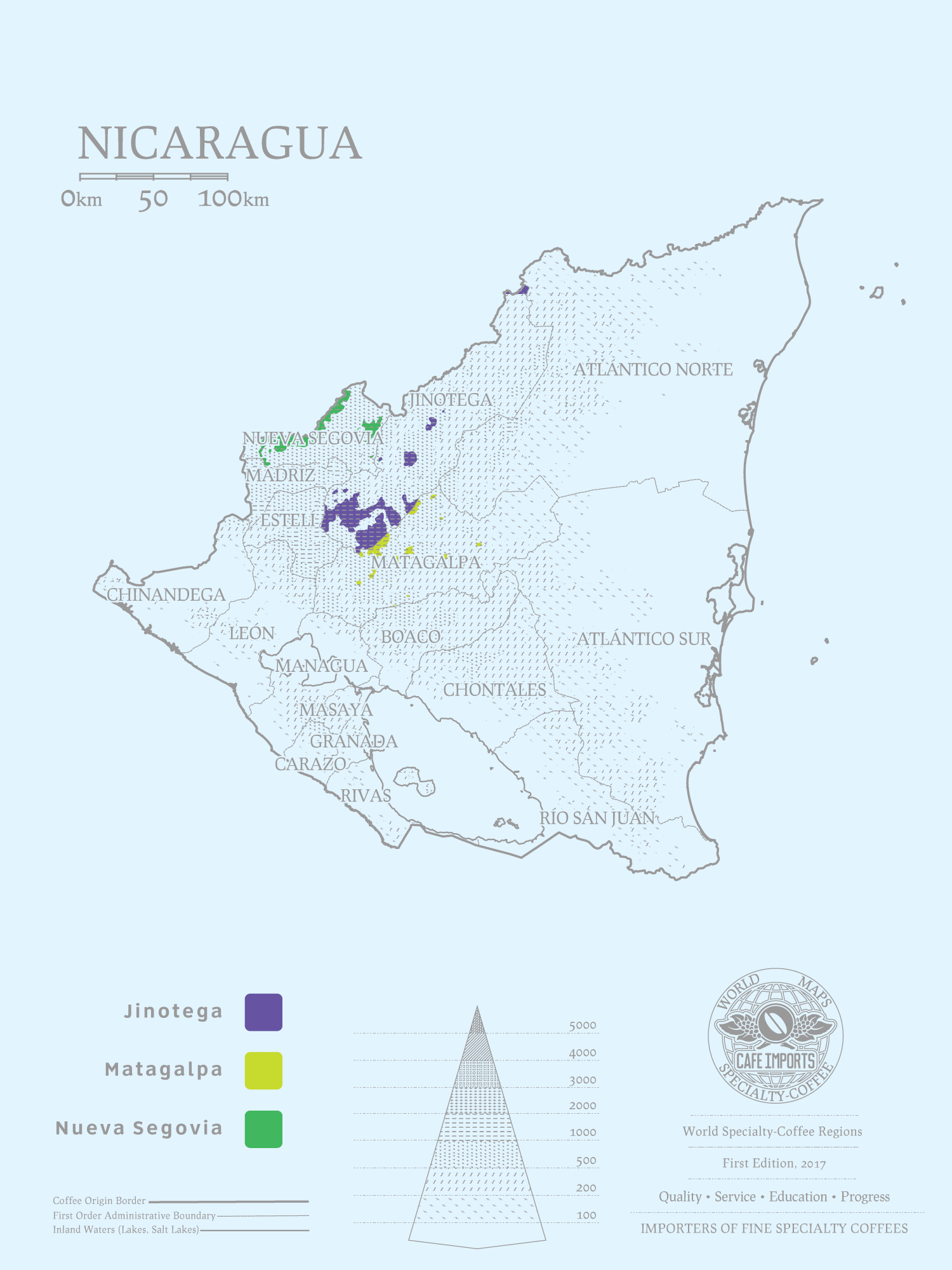Первые кофейные вишни в Никарагуа были высажены на равнинах, но теперь производство сконцентрировано в горной местности. Сорта из зон Estelí, Madriz и Nueva Segovia отличаются тонким фруктовым ароматом и выраженной кислинкой. Зоны Matagalpa и Jinotega могут похвастаться плодородной вулканической почвой, влажным тропическим климатом, богатой растительностью.