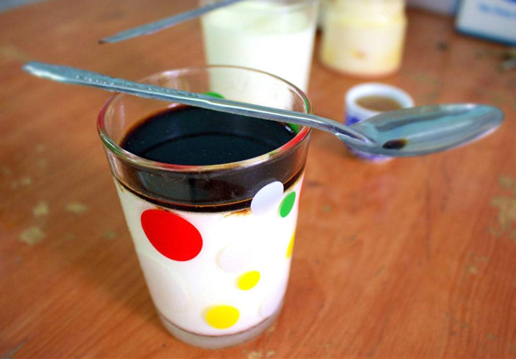 - Самый популярный – со сгущенным молоком. В стаканчик, а кофе в республике пьют только из стаканчиков, наливают сгущенное молоко – примерно ¼ от всего объема посуды. Сверху него — горячий кофе через капельницу. Перемешивать нельзя! Сгущенка медленно растворяется, и тогда получается сладкий крепкий бодрящий напиток.