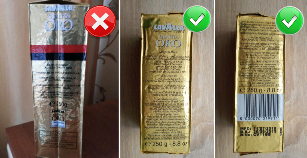 Чаще фальсифицируют кофе в пачках по 1 кг. Несмотря на это проверять нужно каждую пачку. Отсутствие указания на пачке времени изготовления — признак контрафакта.