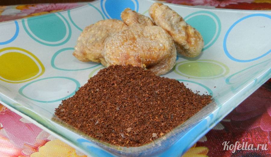 Инжир нарежьте небольшими кусочками и немного обжарьте на сухой сковороде. До тех пор, пока он не станет ломким. После измельчите подсушенные кусочки инжира в кофемолке. Вместе с зернами кофе.