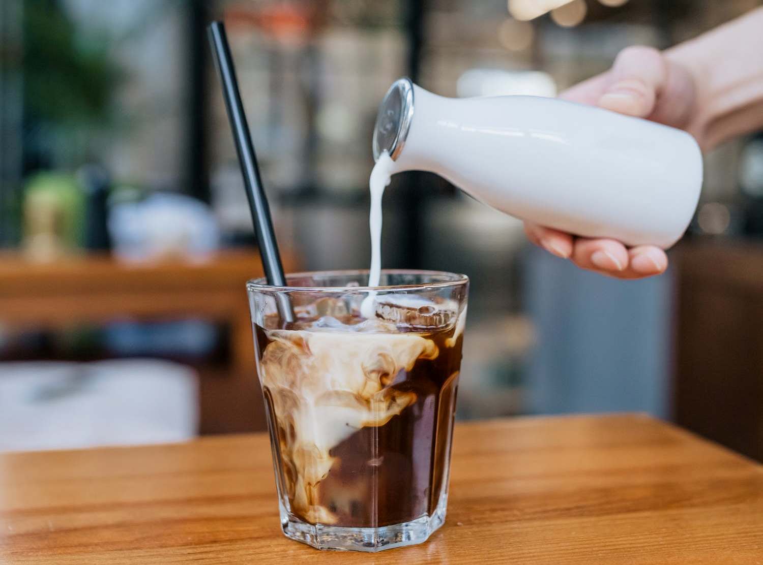 - Добавьте молоко, затем налейте сиропы и перемешайте.