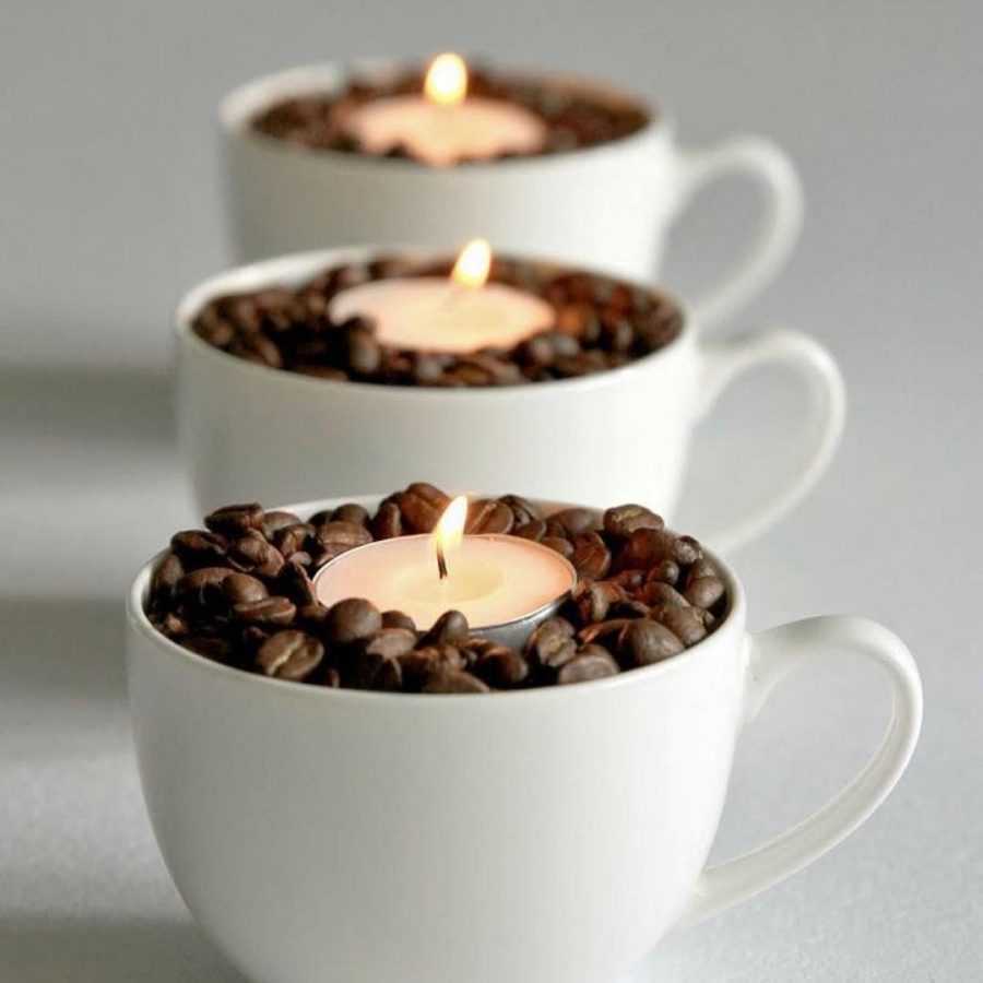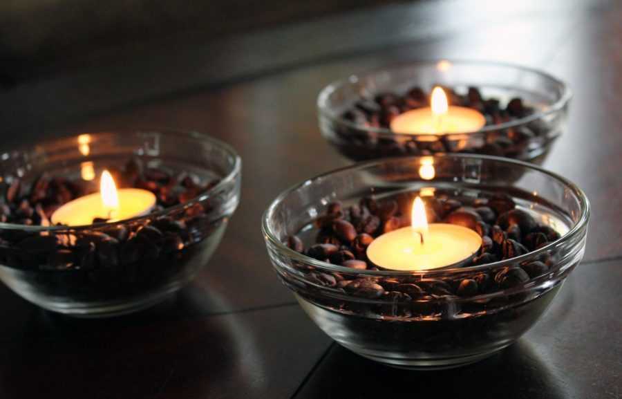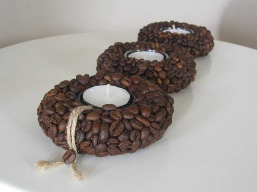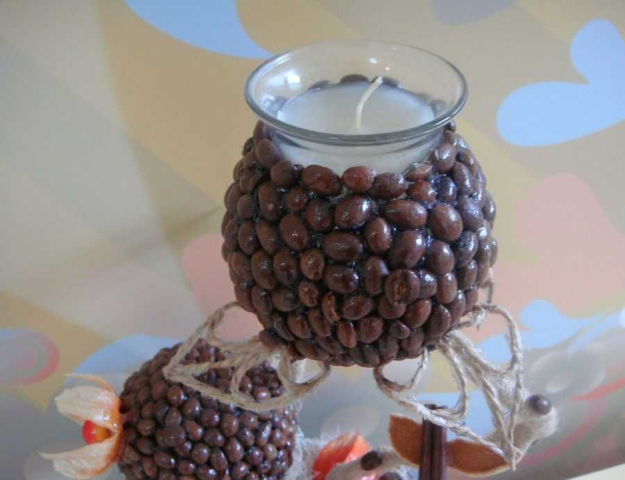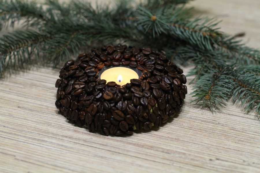 Мастера советуют новичкам начинать декорирование кофейными зернами с самых простых вещей. Один из простейших вариантов, это украшение свечи. Нужно учитывать, что свеча излучает свой аромат. Соответственно ее аромат должен сочетаться с ароматом кофе.