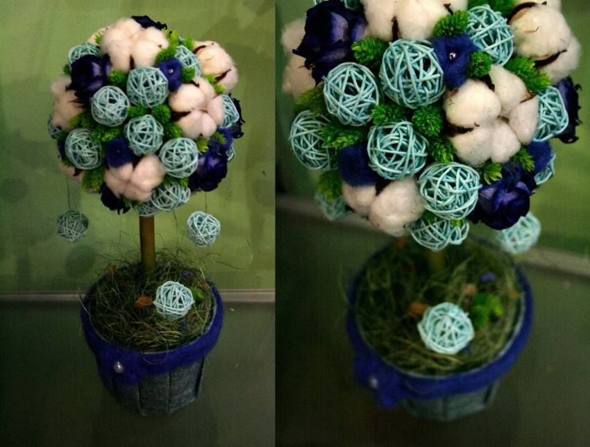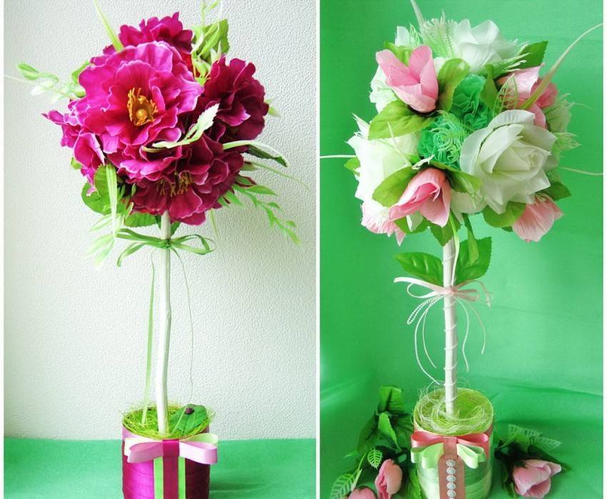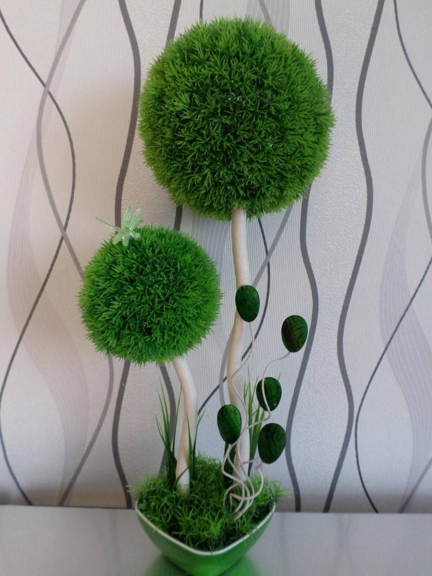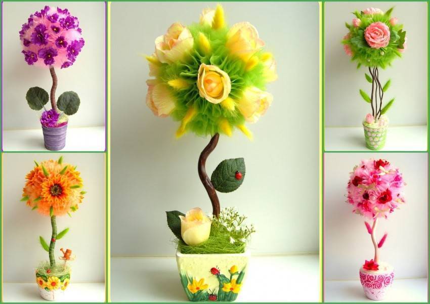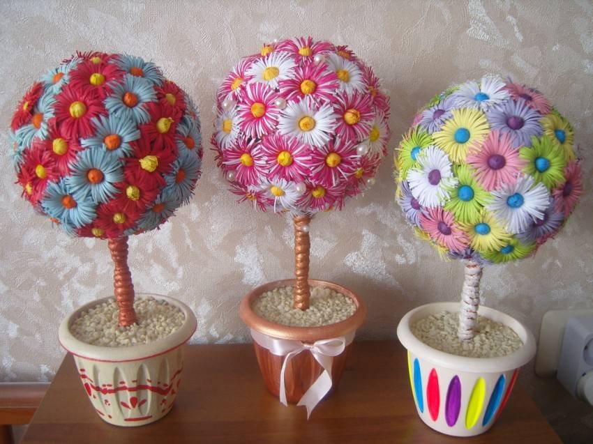 Существуют различные варианты поделок. Особо популярны комнатные топиарии. Декоративные модели с оригинальной кроной, сделанные мастерицами, станут прекрасным подарком к празднику или иному торжеству. Так, можно смастерить мини-деревце счастья, создать топиарий к Новому году или изготовить денежное дерево. В последние годы такие поделки нередко используют в качестве свадебного декора.