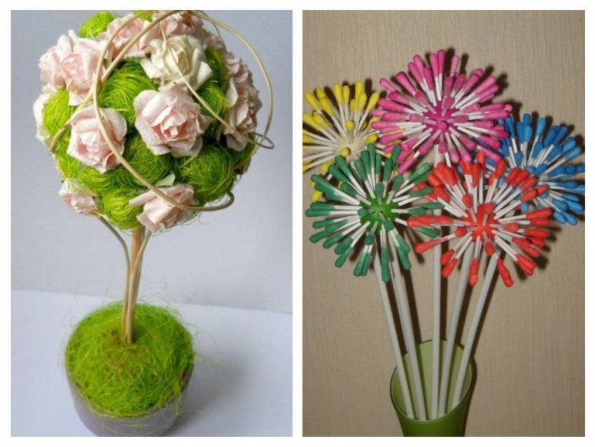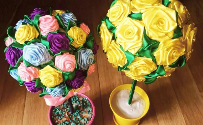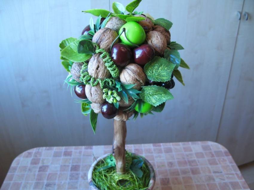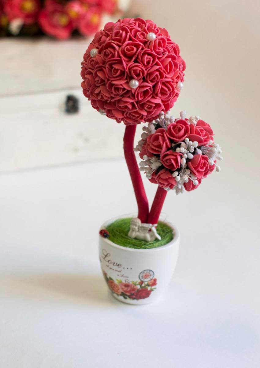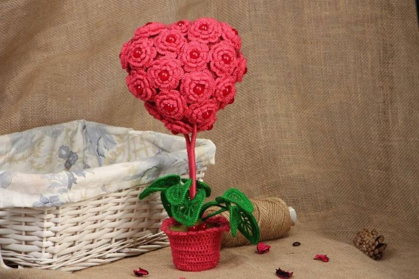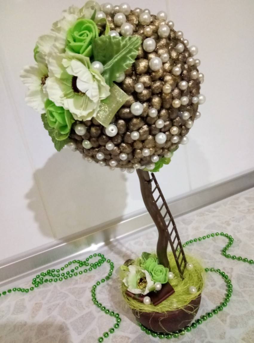 Существуют различные варианты поделок. Особо популярны комнатные топиарии. Декоративные модели с оригинальной кроной, сделанные мастерицами, станут прекрасным подарком к празднику или иному торжеству. Так, можно смастерить мини-деревце счастья, создать топиарий к Новому году или изготовить денежное дерево. В последние годы такие поделки нередко используют в качестве свадебного декора.