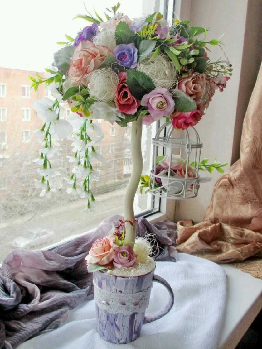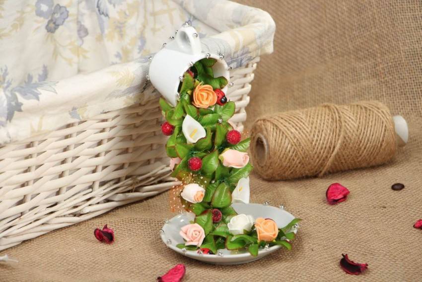 - В качестве основы можно выбрать чашку, мини-кофейник или молочник, декоративное ведерко или цветочный горшок (но в нем нужно заклеить отверстие на дне). Можно ставить чашку на блюдце, приклеить ее, чтобы изделие не переворачивалось.