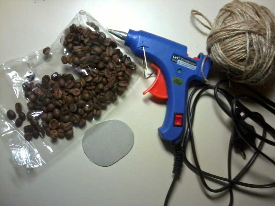 Получившуюся основу окрашиваем коричневой краской. Затем на ее поверхность приклеиваем кофейные зерна.