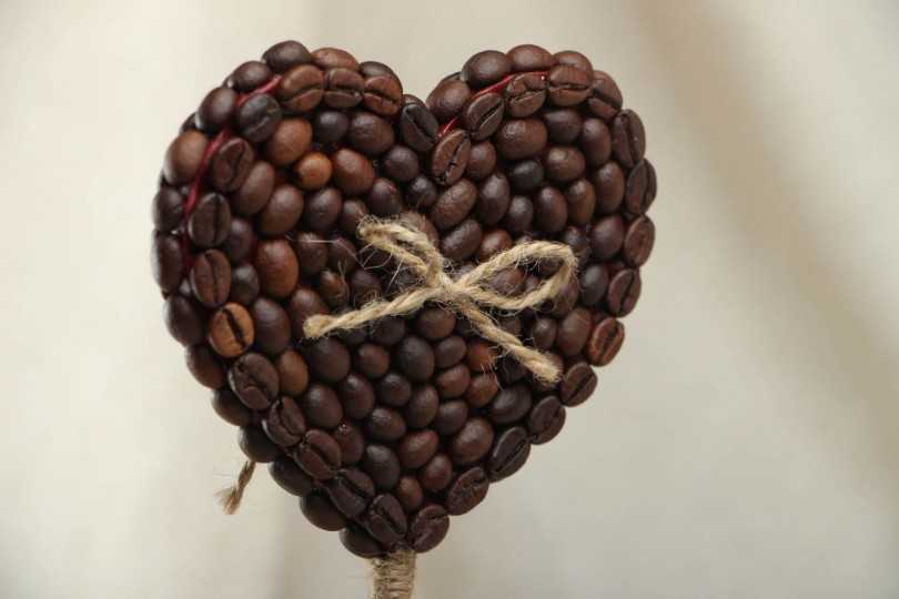 Сделать кофейный топиарий своими руками можно самой разной формы. Одним из возможных вариантов является сердце.