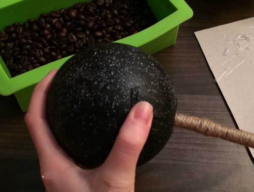 Резиновые мячики разрезаются на две равные части, которые набиваются синтепоном. После этого обе половинки обшиваются тканью, совпадающей по цвету с зернами кофе. Затем в два слоя наносятся зерна при помощи клей-пистолета.