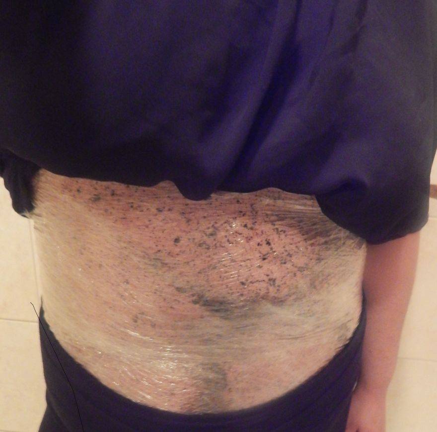 Важно насухо вытереть очищенную кожу. Потом нанести готовую маску для домашнего обертывания на нужную проблемную зону, будь то живот, ягодицы или руки.