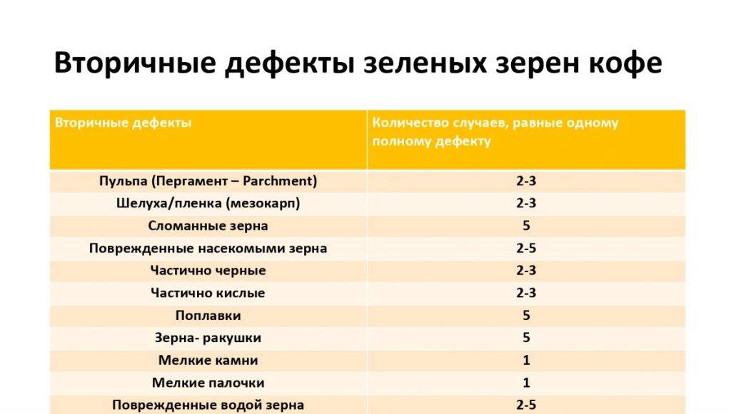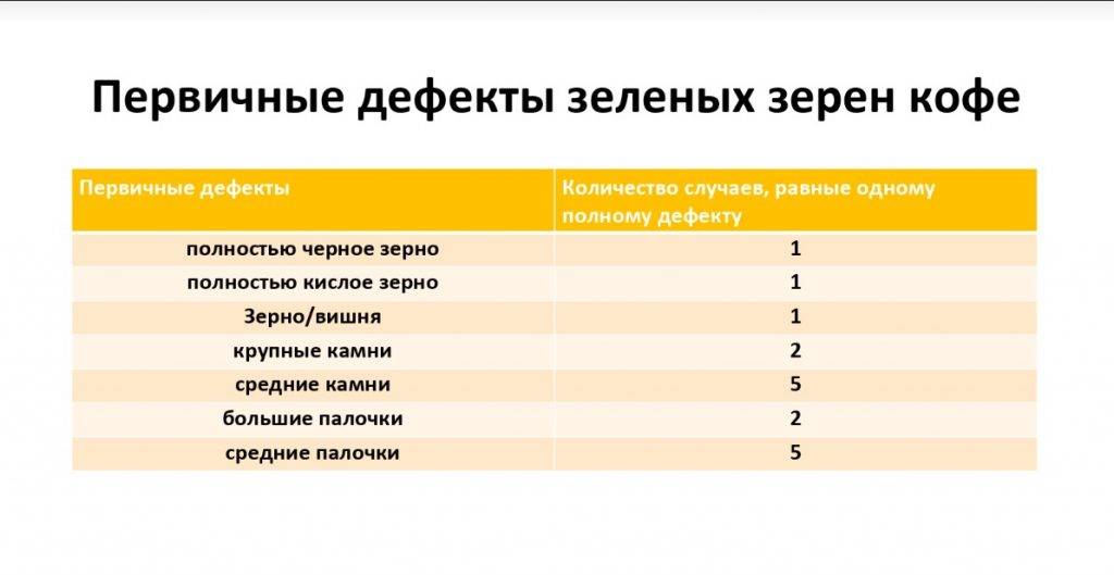 Некондиционный кофе (5): более 86 дефектов в 300 грамм. Ниже приведена таблица для оценки кофейных зерен. Он основан на основном дефекте и количестве дефектных кофейных зерен.