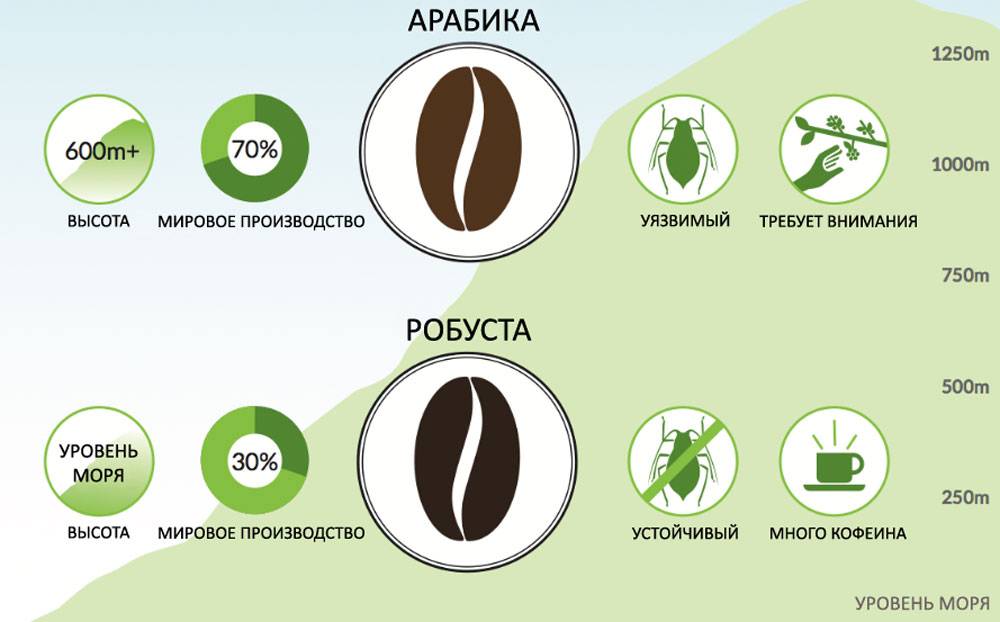 Какие различия между робустой и арабикой? Сначала нужно определить, что такое «вид» и «сорт» кофе. Всемирно известные робуста, арабика, а также менее знаменитые эксцельза, либерика относятся к видам кофейных деревьев, а у каждого из них имеются сорта, которые используют производители для изготовления напитков.
