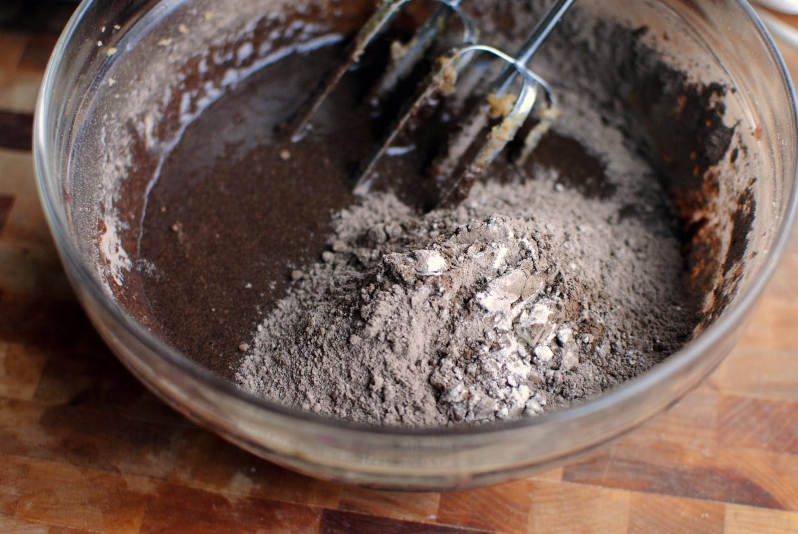 Шоколадный маслянистый состав выливают в муку и производят перемешивание движением сверху вниз. Как только мука превратится в тесто, действие прекращают.