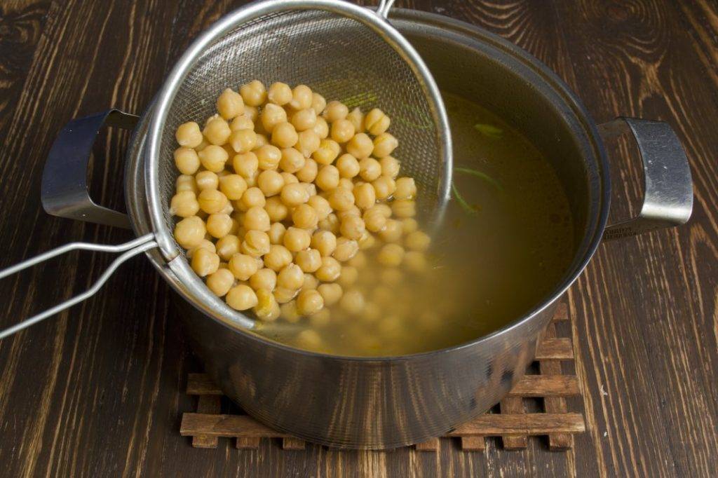 Сначала промывают и замачивают в холодной воде 200 г нута на 10-12 часов.