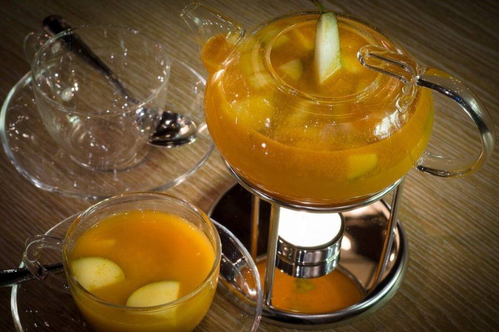 Благодаря добавлению груши напиток получается сладковатым, с фруктовым ароматом. Используйте спелый плод, он быстро пускает сок в кипятке. Заварите 1 ст.л. крупнолистового черного чая стаканом кипятка, сюда же добавляем половину мелко нарезанной груши и 1 ч.л. облепихового пюре. Через 10 минут подаем.