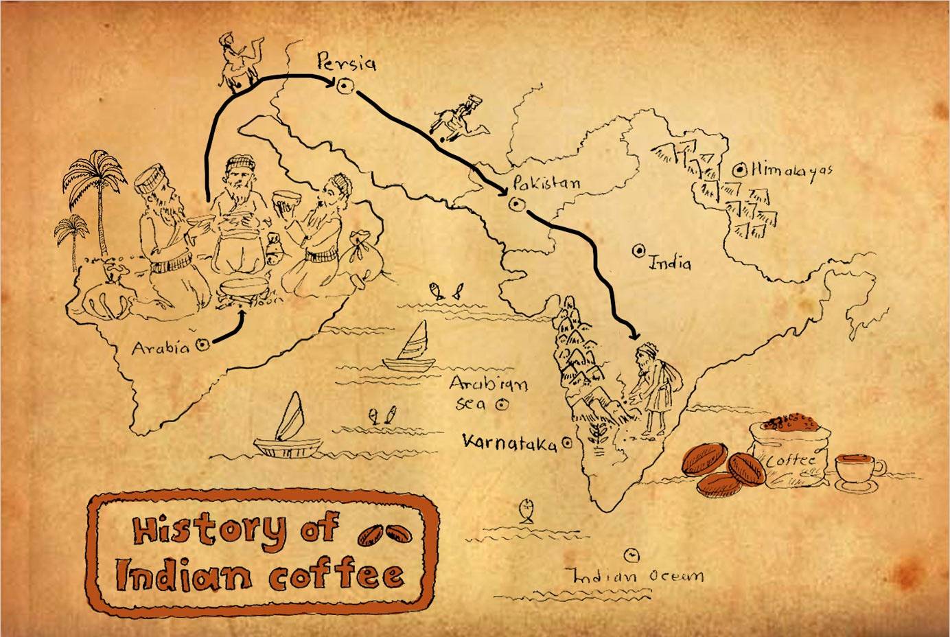 Кофе в Индии появился во второй половине XVII века благодаря легендарному паломнику по имени Баба Будан. Пилигрим съездил в Мекку и вывез контрабандой из Йемена семь зернышек зеленого кофе, спрятав их в своей бороде. Святой посадил кофе в месте, которое теперь называется Baba Budan Hills (Холмы Бабы Будана) и расположено в штате Карнатака.